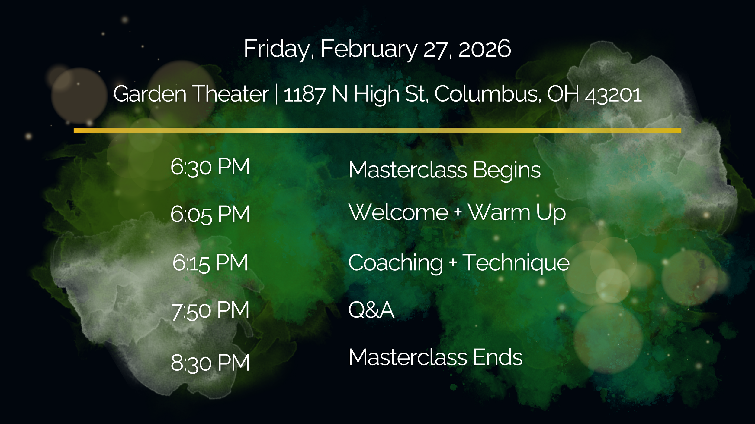 The evening will include a welcoming group warm-up, individual coaching with six selected performers (with valuable takeaways for all attendees), and a closing Q&A with Eden.